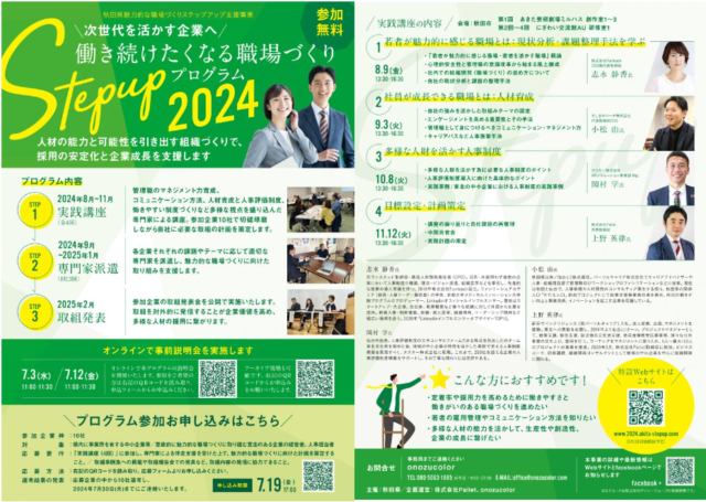 県では、人材確保に向けた県内企業の主体的な取組を促進するため、「働き続けたくなる職場づくり Step up プログラム 2024」を実施し、実践講座や専門家による伴走支援を通じて、多様な勤務形態や人事評価制度の導入など、魅力的な職場づくりに向けた取組を支援しています。