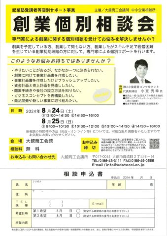 創業個別相談会 5 8月,2024 info@odatecci.or.jp 当所では創業予定者や創業して間もない方を対象とした専門家による個別相談会を開催します。ぜひ、ご参加ください。 創業個別相談会【PDF】