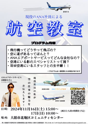 今年もANA職員を講師に招き、飛行機や空港についてココでしか聞くことができないことを紹介します!航空教室限定のANAオリジナルグッズもご用意しております!