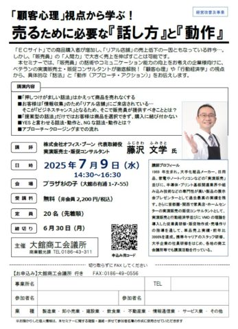 7/9売るために必要な『話し方』と『動作』を、ベテラン実演販売士・販促コンサルタントが徹底解説! 3 7月,2025 info@odatecci.or.jp 販売員の人間力で売上は大きく伸ばせます。 「顧客心理」や「行動経済学」の視点から、具体的な『話法』と『動作』をお伝えします。 1.日 時 2025年7月9日(水)14:30~16:30 2.場 所 プラザ杉の子 3.受講料 会員無料、非会員2,200円 4.定 員 20名(先着順) チラシ・申込書はこちら