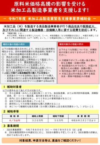 詳しくは、県公式サイト「令和7年度米加工品製造業緊急支援事業費補助金の募集について」をご確認ください。