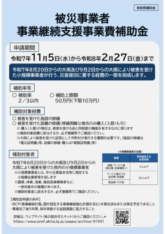 令和7年度被災事業者事業継続支援事業費補助金について(秋田県HP)